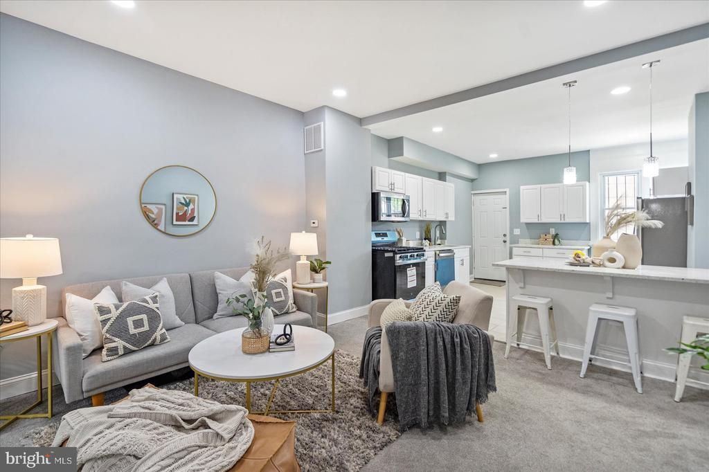 Beautifully renovated three-bedroom, three full-bath rowhome featuring an open and airy floor plan filled with natural light. Highlights include recessed lighting, fresh paint, and new carpet throughout. The modern kitchen offers quartz countertops, stainless steel appliances, a large island, and contemporary finishes. Upper level includes two spacious bedrooms, one being a primary suite with a private full bath. Fully finished lower level features a third bedroom and full bathroom—ideal for guests or flexible living space. Major updates include a new roof, HVAC system, and hot water heater. Conveniently located in the heart of Baltimore and move-in ready. Property may be eligible for a $5,000 homebuyer grant and an additional $2,500 grant for qualified buyers through Chase.