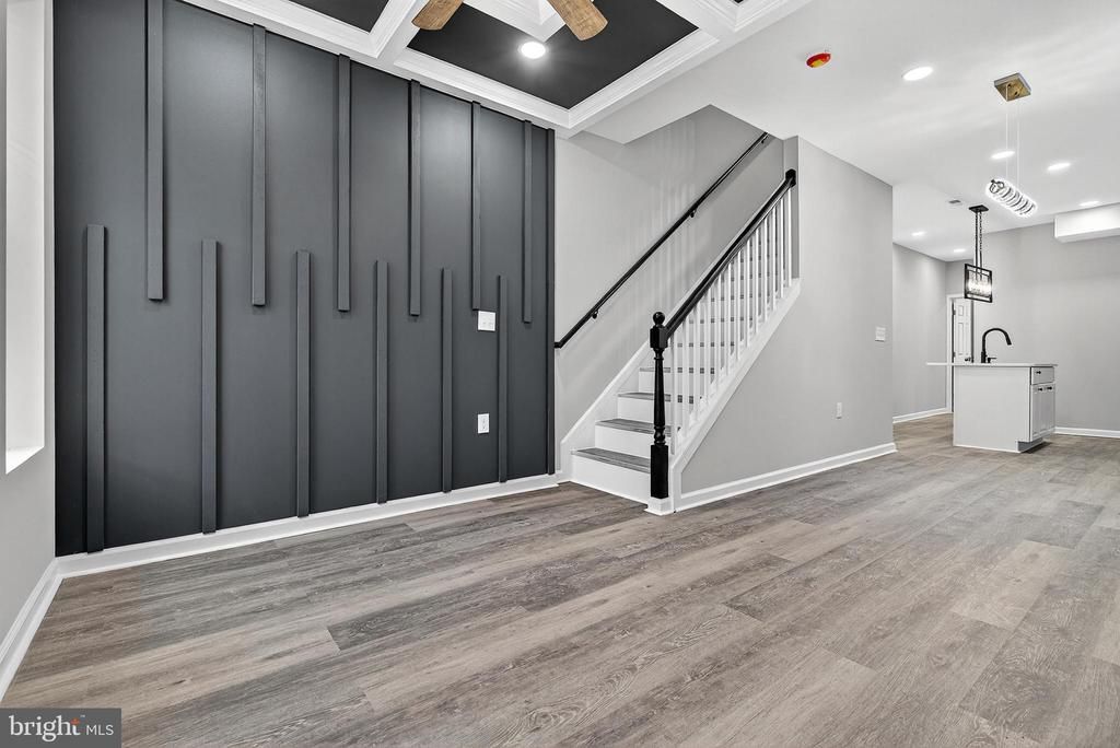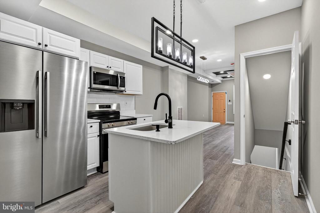 Fully Renovated Urban Retreat Experience the pinnacle of modern urban living in this immaculately and fully renovated rowhome. Meticulously redesigned with a focus on contemporary elegance and high-end finishes, this property offers a seamless blend of luxurious style and functional, multi-level living. Step into an open-concept main floor defined by dramatic design choices and rich textures. The entry/living room makes an immediate statement with a bespoke coffered ceiling painted in a sophisticated black and white scheme, perfectly complementing the custom dark charcoal accent wall featuring modern vertical paneling. Durable, wide-plank Luxury Vinyl Plank (LVP) flooring flows throughout the main level and finished basement, offering both style and easy maintenance. The space flows effortlessly into a sleek, galley-style kitchen anchored by crisp white shaker cabinetry and brilliant white quartz countertops. A central island provides a functional prep area and features a dramatic, modern matte black faucet and sink. The kitchen is equipped with a full suite of premium stainless steel appliances. The upper floors host bright, serene bedrooms finished with plush neutral carpeting for maximum comfort. Bedrooms are generously sized, bathed in natural light, and continue the home's calm, neutral palette. Both full bathrooms are true showpieces, showcasing exceptional craftsmanship. Large-format tiles with elegant gray veining create a bright, spa-like atmosphere. One bathroom features a luxurious mix of white and gold-toned hexagon mosaic tiles and high-end gold fixtures (faucet, showerhead, and hardware), while another utilizes striking black or white penny tile accents with modern black hardware. Both include stylish gray vanities, underscoring the modern aesthetic. The fully finished lower level provides excellent flexible space, perfect for a media room, home gym, or spacious office. The exterior is well-maintained with a charming light-colored brick facade and a distinct coral-colored accent door. This listing represents a turnkey opportunity for a discerning buyer seeking a home where every detail has been thoughtfully updated with a focus on modern luxury and design. Schedule your showing today!